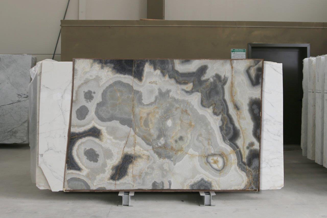 Onice Nero in lastre. Il prezzo indicato è inteso per l'intera quantità, per carichi parziali il prezzo aumenta di circa il 20%. Le lastre sono retinate, resinate e lucidate a macchia aperta e dunque vengono solitamente vendute in numero pari.